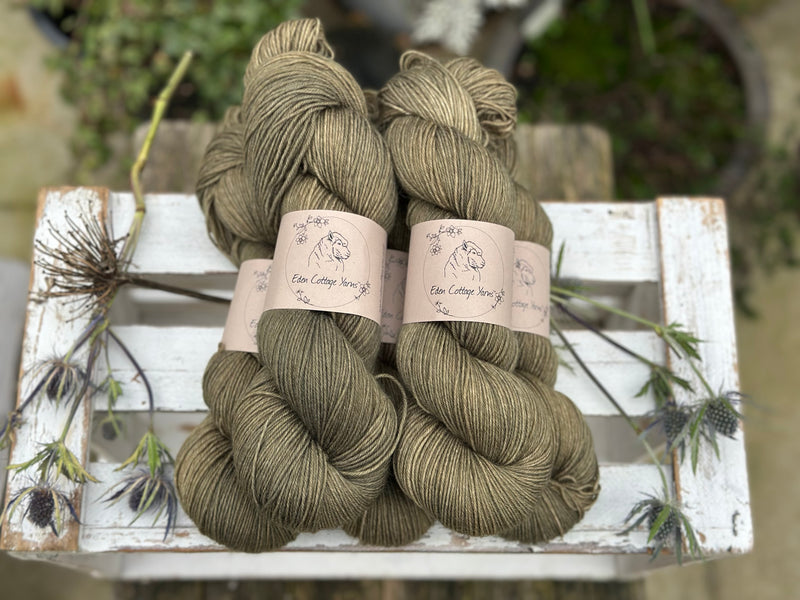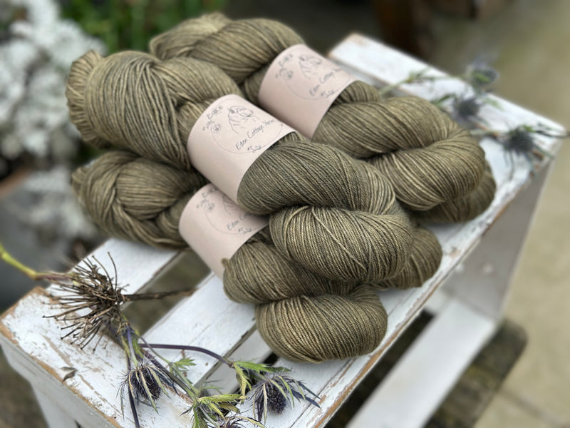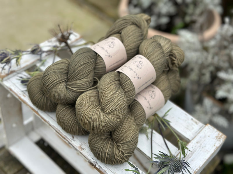 Hand dyed 75% superwash merino, 25% nylon 4ply sock yarn in colourway Wax Jacket - this is a soft, earthy, muddy olive(ish) green.