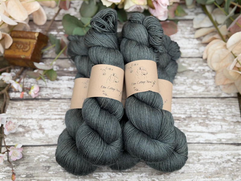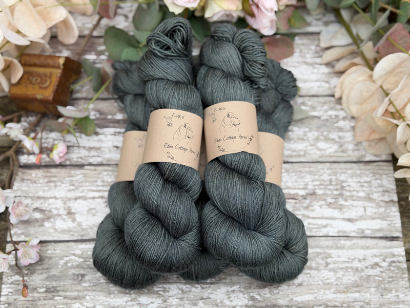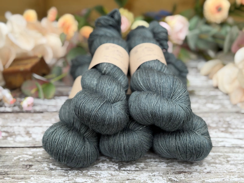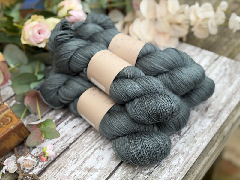Hand dyed superwash merino and silk 4ply sock yarn in colourway Ink - a dark stonewashed inky grey-blue.