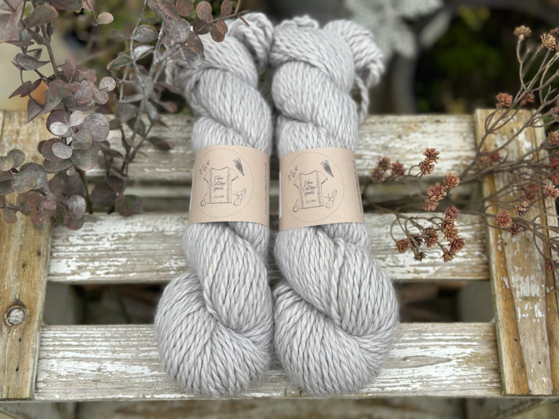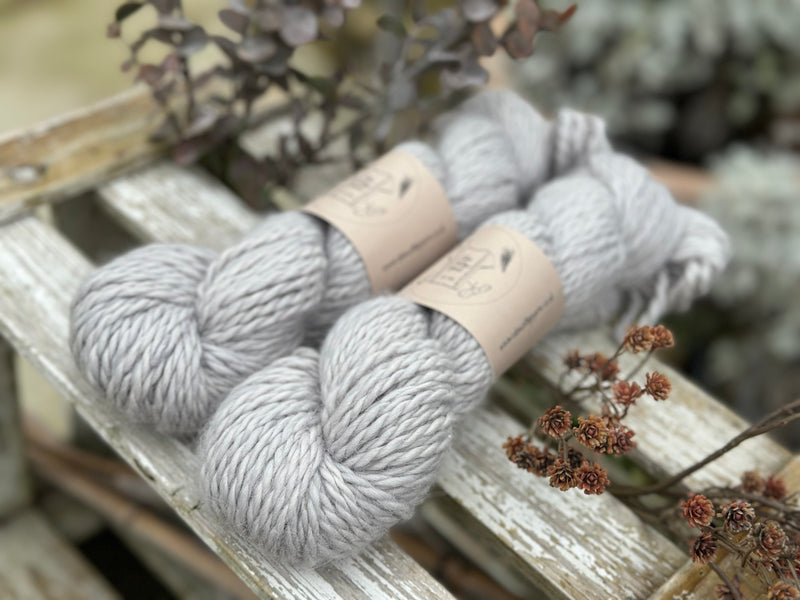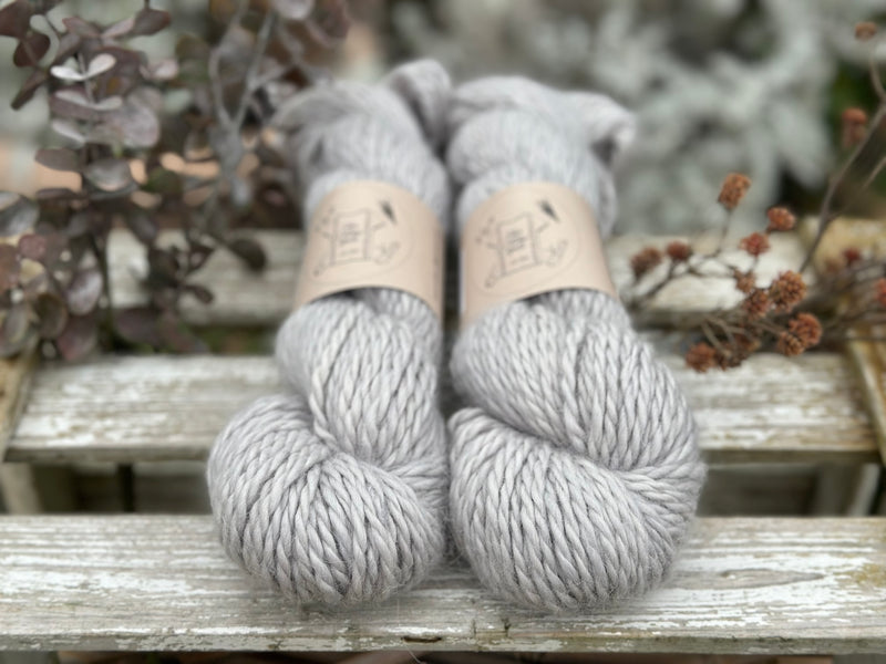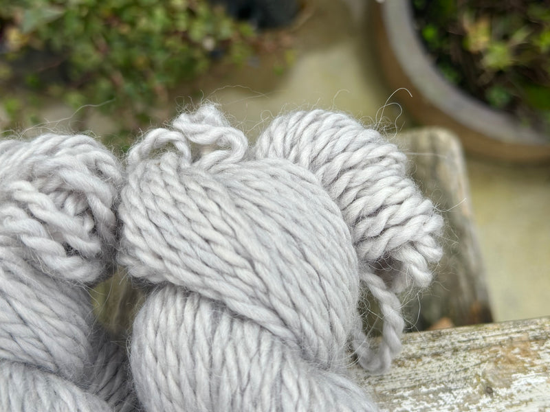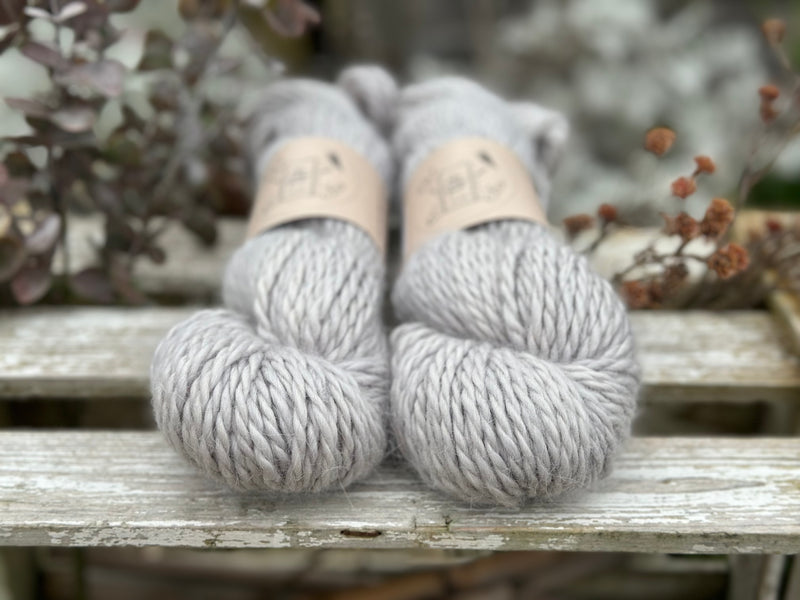 Hand dyed chunky baby alpaca in colourway Echinops - a very light, warm, silvery-blue.